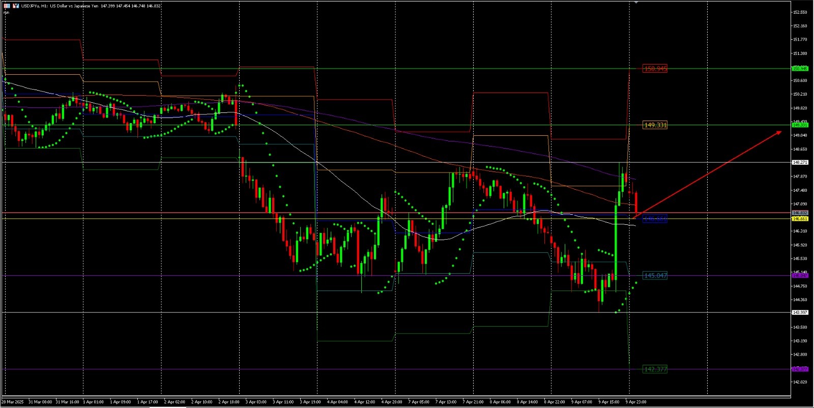 USD/JPY kembali bergerak turun tajam setelah sempat memantul dari level rendah multi-bulan di 144,55. Arah bearish menguat karena harga tertolak dua kali dari resistance Tenkan/Kijun-sen harian. Situasi ini memicu sinyal jebakan bullish dan memperkuat tekanan jual di grafik harian. Kenaikan tajam tarif AS atas semua impor dari China memperburuk sentimen pasar global.