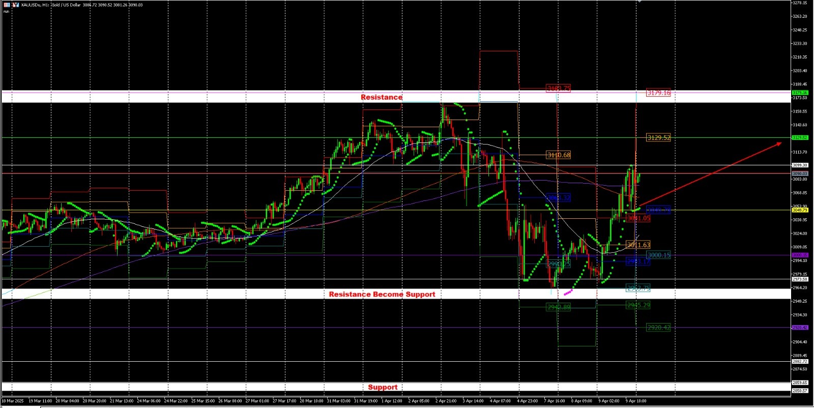Tekanan jual terhadap Euro menurun di dekat support 1.0900, tetapi belum cukup kuat untuk dorong rally baru. Jika tekanan jual kembali muncul, EUR/USD bisa menguji EMA 200-hari di bawah 1.0700. Zona resistance tetap kuat antara 1.1000 hingga 1.1100, menjadi batas atas pergerakan Euro saat ini. Pemulihan tajam bulan Maret belum cukup membalikkan tren jangka menengah Euro yang cenderung netral ke bearish. Kondisi pasar tetap fluktuatif, dengan fokus utama pada kebijakan tarif dan rilis inflasi AS pekan ini.
