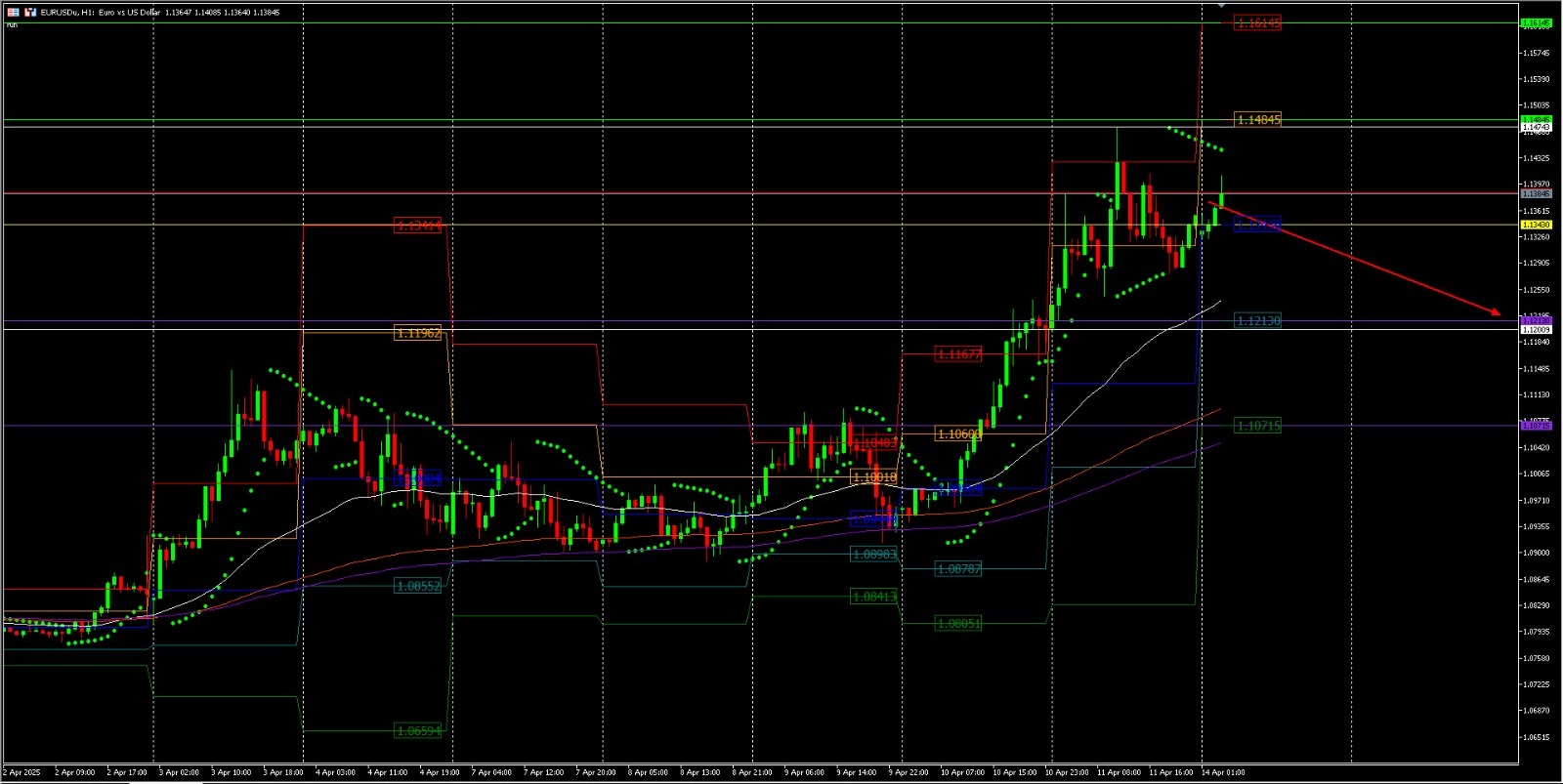 EUR/USD kembali melemah di sekitar 1,1350 setelah menguat dalam dua sesi sebelumnya. Dolar AS melemah, tapi ketegangan dagang justru menekan EUR/USD lebih rendah. Pasar khawatir terhadap meningkatnya risiko resesi akibat perang dagang antara AS dan Tiongkok. Tiongkok menaikkan tarif barang AS hingga 125% sebagai respons terhadap tarif 145% dari Trump. Menteri Keuangan Tiongkok menyatakan tindakan ini sebagai bentuk perlindungan ekonomi nasional.