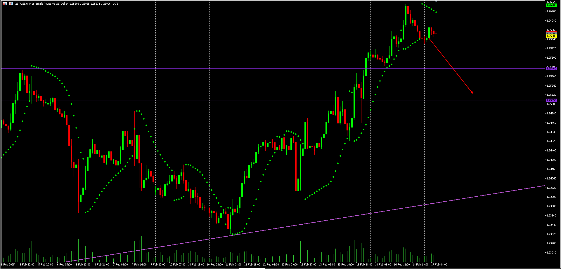 GBP/USD pada timeframe H1 menunjukkan tanda-tanda kemungkinan pembalikan bearish setelah mencapai level resistance kunci di sekitar 1.2620 – 1.2630. Indikator Parabolic SAR telah berbalik di atas harga, menandakan potensi perubahan momentum. Penolakan di level resistance ini mengindikasikan kemungkinan penurunan menuju area support 1.2500, sejalan dengan proyeksi penurunan yang ditunjukkan oleh panah merah. Namun, jika harga menembus dan menutup di atas 1.2630, tren naik mungkin akan berlanjut menuju 1.2700. Trader sebaiknya menunggu konfirmasi sebelum membuka posisi, dengan setup jual yang menargetkan 1.2500 sambil menjaga stop loss di atas 1.2630.