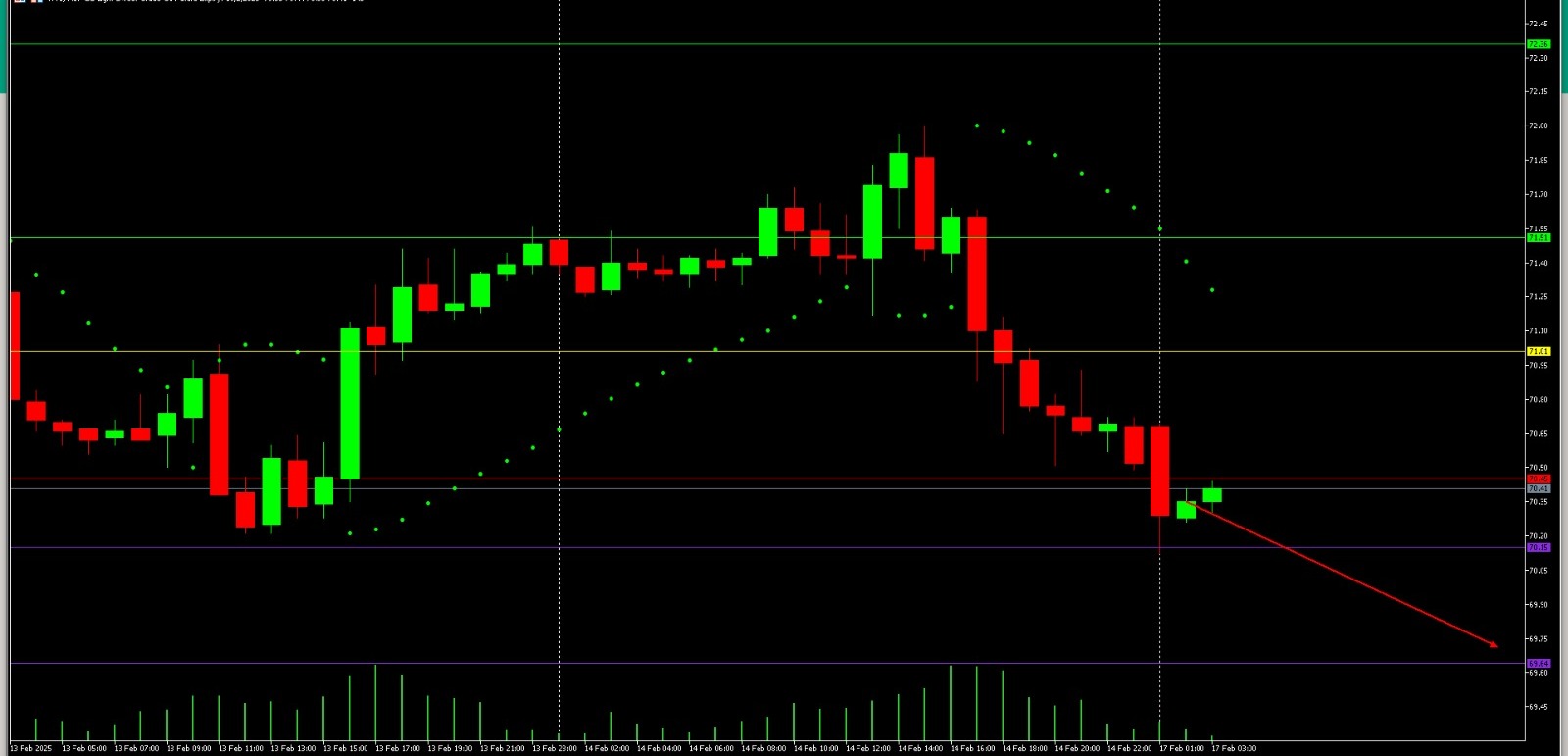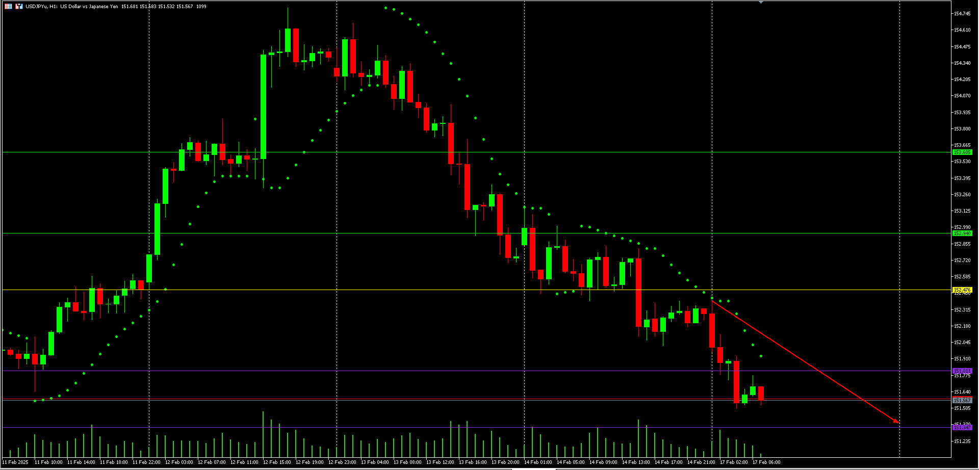 Berdasarkan chart USD/JPY H1, harga sedang berada dalam tren turun yang kuat, ditandai dengan serangkaian lower highs dan lower lows serta Parabolic SAR yang berada di atas candlestick. Level support utama terlihat di sekitar 151.500 – 151.300, sementara resistance terdekat berada di sekitar 152.250 – 152.500. Jika harga berhasil menembus support di 151.500, ada potensi penurunan lebih lanjut menuju 151.300 atau bahkan lebih rendah. Sebaliknya, jika terjadi pullback dan harga mampu menembus resistance di 152.250, ada kemungkinan koreksi naik menuju 152.990. Volume yang meningkat saat harga turun mengonfirmasi tekanan bearish yang masih dominan. Strategi entry dapat mempertimbangkan sell jika harga tetap di bawah resistance dengan target di 151.300, sementara konfirmasi breakout lebih lanjut diperlukan sebelum mengambil keputusan buy.
