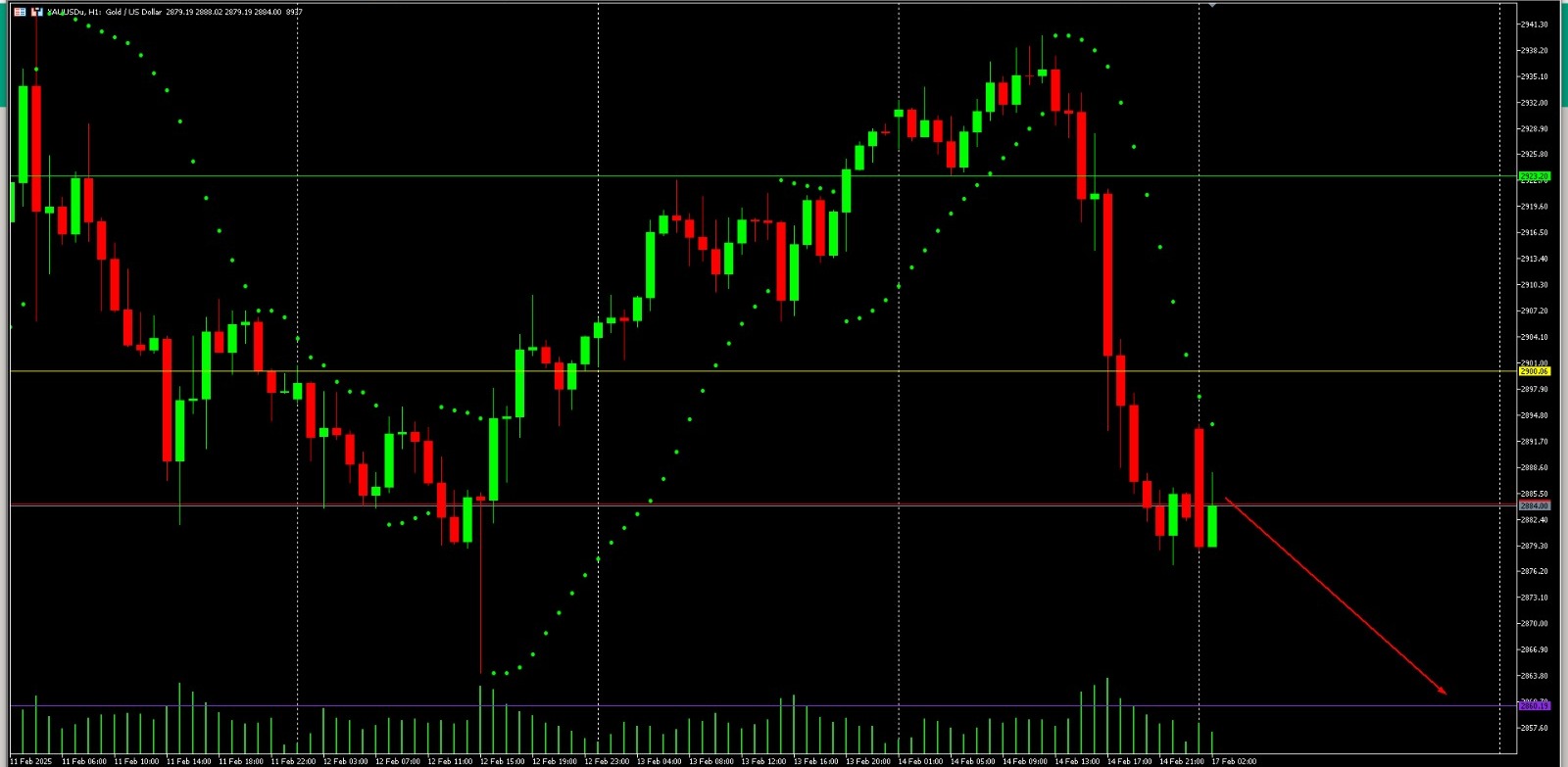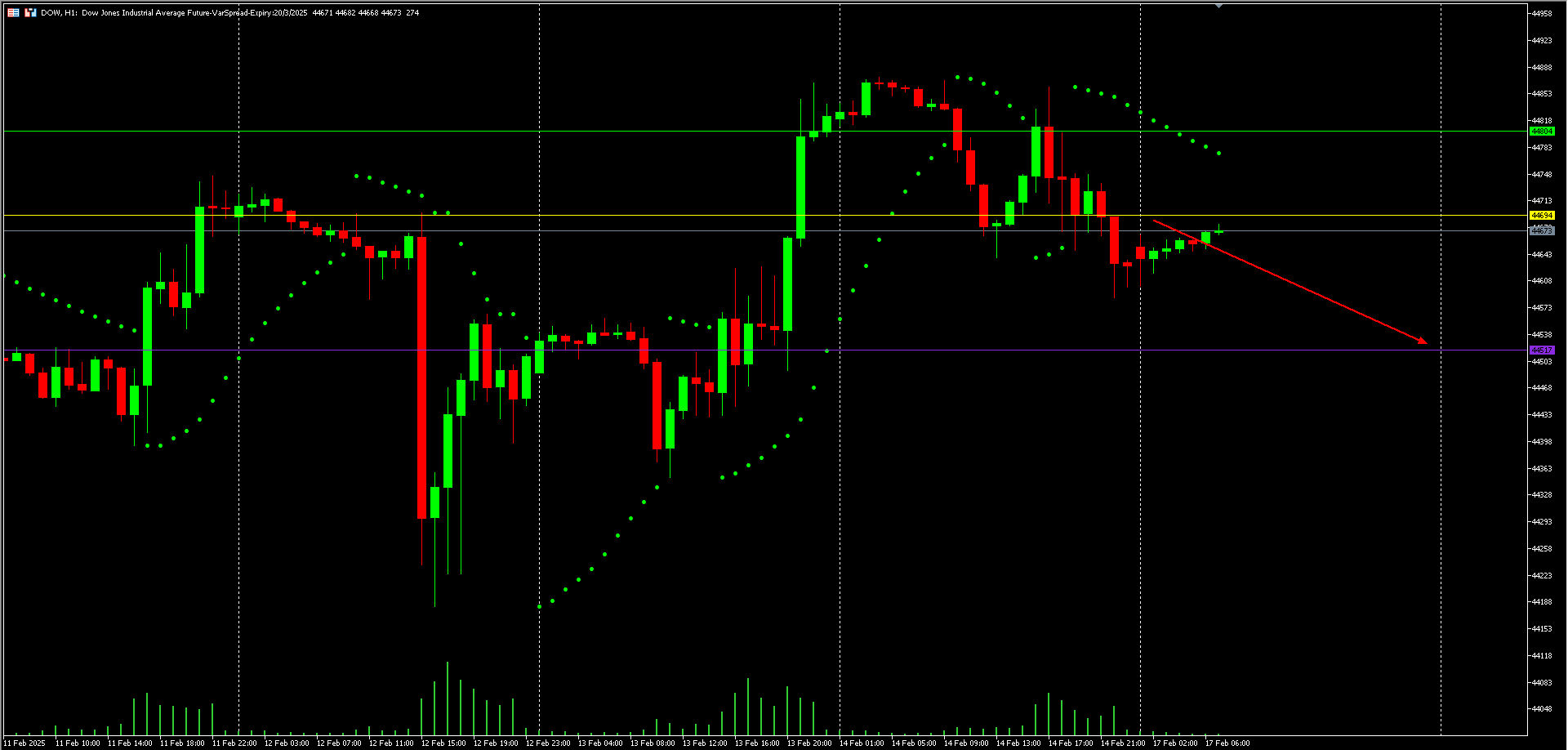 Berdasarkan chart Dow Jones (DOW) H1, harga saat ini berada dalam fase konsolidasi setelah mengalami pergerakan volatil sebelumnya. Parabolic SAR menunjukkan kecenderungan bearish dengan titik-titik berada di atas candlestick, yang mengindikasikan potensi kelanjutan tren turun. Level support utama berada di sekitar 44830, sementara resistance kunci di area 44920 – 44950. Jika harga gagal menembus resistance dan tetap berada di bawahnya, ada kemungkinan penurunan lebih lanjut menuju support di 44830 atau lebih rendah. Sebaliknya, jika harga mampu menembus 44950 dengan volume yang meningkat, maka tren dapat berubah menjadi bullish dengan target ke 45000. Untuk strategi entry, posisi sell dapat dipertimbangkan jika harga menolak resistance dengan konfirmasi candlestick bearish, sementara buy baru relevan jika terjadi breakout di atas 44950.